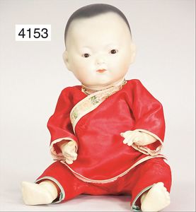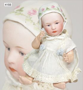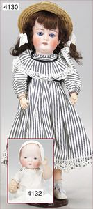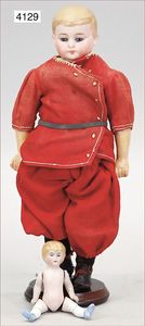 Biskuitporzellan-Brustblattkopf-Puppe, gemarkt R.510 Dep, 42 cm, braune Schlafaugen, off. Mund, oben Zähne, Kinngrübchen, Mohairperücke, kl. Stelle am Augenlid ausgebessert, Lederkörper, Porzellan-Unterarme, alte Kleidung, alte Schuhe, mit Spielpuppe, Perücke wurde nicht entfernt, Transportrisiko für Augenmechanismus beachten, von außen keine Risse erkennbar