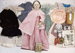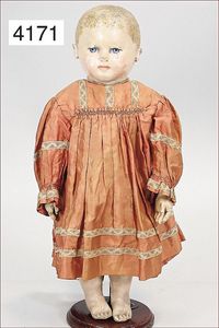 Papiermaché-Brustblattkopf-Puppe, 66 cm, braune fest eingesetzte Glasaugen, off./geschl. Mund, Stoffkörper, Masse-Arme, Kleidung alt o. aus alten Stoffen genäht, alte Mohairperücke wurde nicht entfernt