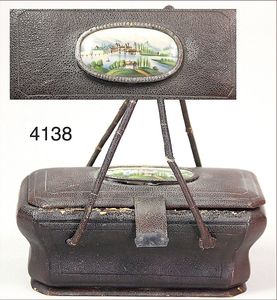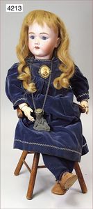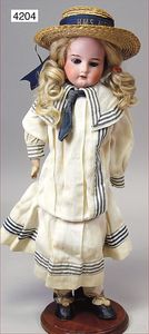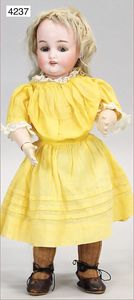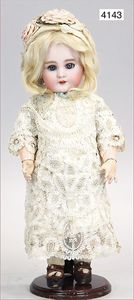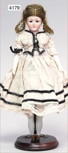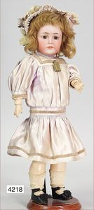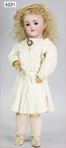 KESTNER Biskuitporzellan-Brustblattkopf-Puppe, 40 cm, braune Schlafaugen, Orig.-Mohairperücke, Orig.-Gipsdeckel wurde nicht entfernt, keine Risse von außen erkennbar, Transportrisiko für den Augenmechanismus beachten, off. Mund, oben Zähne, Lederkörper, Porzellan-Arme, Stoffbeine, alte Kleidung