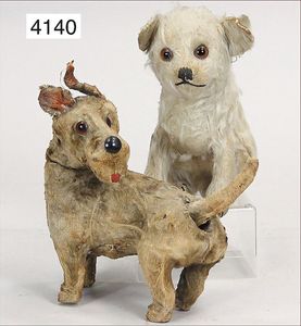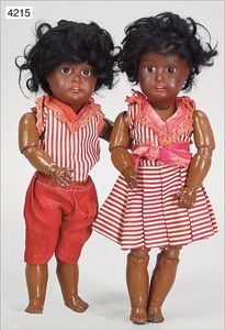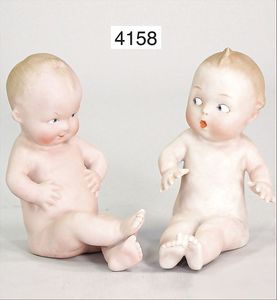 KESTNER 134, Biskuitporzellan-Geschwisterpaar, als Junge u. Mädchen, Kurbelkopf, braune Schlafaugen, Orig.-Gipsdeckel wurde nicht entfernt, Transportrisiko für Augenmechanismus beachten, von außen keine Risse erkennbar, dunkel getönte Gliederkörper, schöne Orig.-Kleidung, schöne Orig.-Perücken