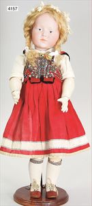 KÄTHE KRUSE Friedebald, Stoffkopf, Hinterkopfnaht erst unter der Perücke sichtbar, Trikotkörper, abgenähte Kniekehlen, helle Bemalung, guter Zust., alte Kleidung