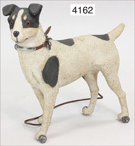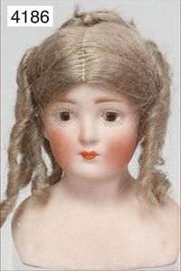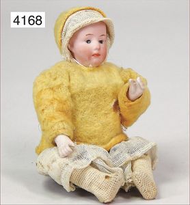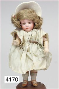 Biskuitporzellan-Vollkopf, Belton Typ, gemarkt Nr. 2, fest eingesetzte braune Paperweightaugen, geschl. Mund, Masse-Stehkörper, mit abgespreizten Händen, ausmodellierte Schuhe u. Strümpfe, alte Mohairperücke, 26 cm, Puppen-Preisführer Grundmann 01/02 Seite 130