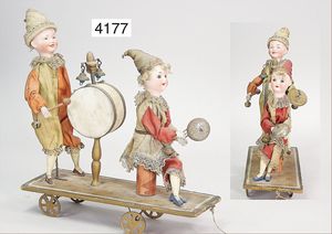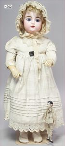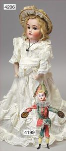 GAULTIER franz. Bebe, gemarkt FG10, Biskuitporzellan-Kurbelkopf, geschl. Mund, gr. mandelförmige blaue Paperweightaugen, Riss auf der rechten Stirnseite, Holz-Unterarme u. –Beine, wohl Geslandkörper?, fein ausmodellierte Finger sowie Füße, 66 cm, alte Perücke, alte Kleidung, alter Korkdeckel sowie Unterkleidung, kl. Spitzenhäubchen, dazu kl. hölzerne Hampelmann-Puppe, bewegl., 19 cm