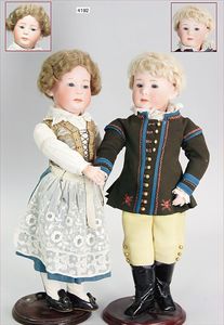 HEUBACH 6969, Pauty, Biskuit-Brustblattköpfe, Junge u. Mädchen, 43 cm, geschl. Mund, nach Angaben des Einlieferers aus dem Haushalt des schwedischen Königshauses, hochwertige Trachtenkleidung, Gliederkörper in unbespieltem Zust., alte Mohairperücken, sehr ausdrucksstark