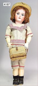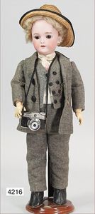 HEINRICH HANDWERCK Biskuitporzellankopf-Puppe, 42 cm, braune Schlafaugen, off. Mund, oben Zähne, durchst. Nasenlöcher, alte Mohairperücke, Gliederkörper, außergew. Jungenkleidung, mit Puppen-Taschenuhr, Fotoapparat wohl 30er Jahre, mit Hut