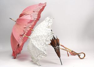 Dekorationsstück für gr. franz. Bebe, Flanierschirme, 1 x 70 cm, 1 x gr. Kinder-Flanierschirm, 90 cm, mit filigran gearbeitetem Metall-Henkel, 1 x Schirm 45 cm, mit Bein-Griff