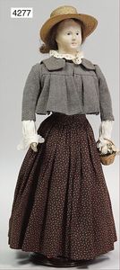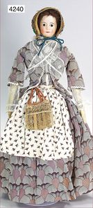 BIEDERMEIER Papiermaché-Brustblattkopf-Dame, fest eingesetzte schwarze Glasaugen, ausmodellierte Nase, geschl. Mund, Nase leicht berieben, weit heruntergezogenes Brustblatt, Stoffkörper mit Lederarmen, fest aufgesetzte braune Echthaare, 50 cm, ausgefallen, ca. 1850 – 1870, alte Biedermeier-Kleid, Tasche u. Hut