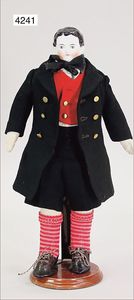 BIEDERMEIER Biskuitporzellan-Brustblattkopf-Chinahead, Junge, weit heruntergezogenes Brustblatt, blaue gemalte Augen, geschl. Mund, schwarze ausmodellierte Haare, frei liegende leicht abstehende Ohren, einfacher Stoffkörper, Kleidung alt, 36 cm