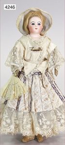 SFBJ 252 Paris, Nackenmarkierung 8, Charakter Mädchen, ca.1910, Biskuitporzellan Kurbelkopf, blaue Schlafaugen, geschl. Mund, feine Ausmodellierung der Mundpartie, Gliederkörper, 52 cm, alte Kleidung