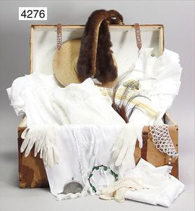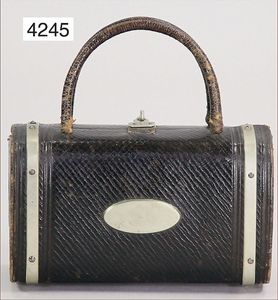 Puppenkoffer (Trousseau), Leder bezogen, 13,5 cm breit, 9 cm hoch, mit 2 Trageriemen, Klappverschluss, innen blaue Seide, wohl orig., ausgefallen