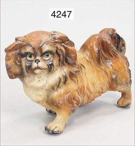 Papiermaché-Hund, Pekinese, Beistellstück für franz. Bebe, 18 cm hoch, 23 cm lang, auf Rollen
