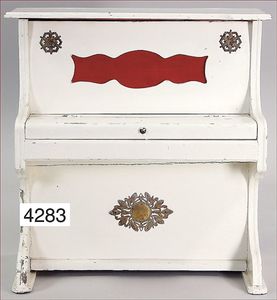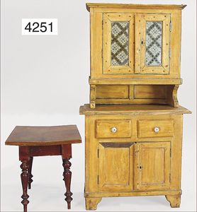 Puppenschrank, Höhe 64 cm, Breite 34 cm, Bierfarbe, bemalte Glasfenster, 1 Tisch, 34 cm breit, 23 cm hoch, bespielt, altersbed. Lackfehler