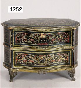 Kommode (Candy Container), Papiermaché, mit Boulle-Ornamenten, Metall-Füße, ca. 1880, 23 cm breit, 16,5 cm hoch