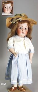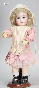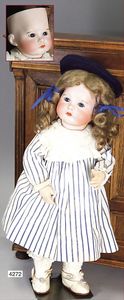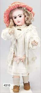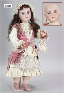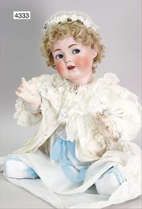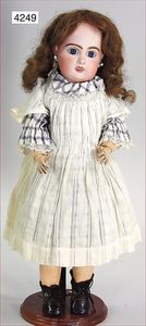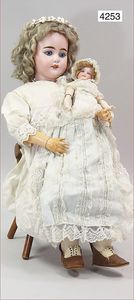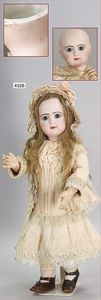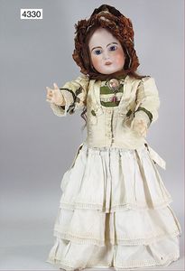 Deposé Tete Jumeau Gr. 15, 85 cm, blaue fest eingesetzte Glasaugen, geschl. Mund, Kinngrübchen, durchst. Ohren, minimaler Chip, kaum sichtbar im linken Augenlid, franz. Gliderkörper, mit festen Handgelenken, restauriert, Perücke neuer, Kleidung neuer, beeindruckende Größe
