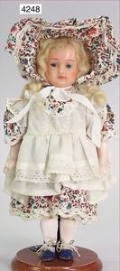 HERTEL & SCHWAB ausgefallenes Googly, um 1910, Biskuitporzellan-Kurbelkopf, Nackenmarkierung 173-6, seitlich blickende Schlafaugen, Melonenmund, Orig.-Toddler-Körper, farblich ausgebessert, blonde Mohairperücke, 42 cm, alte Trachtenkleidung, alte Lederschuhe, mit Expertise von Alfred Barsotti