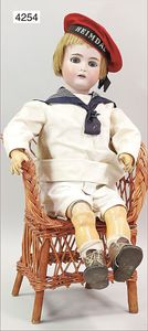 KÄMMER & REINHARDT für Simon & Halbig, Nr. 80, blaue Schlafaugen, Echtwimpern, off. Mund, oben Zahnreihe, Gliederkörper, alte Matrosenkleidung, alte Schuhe, blonde Echthaarperücke, 76 cm