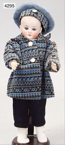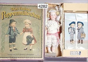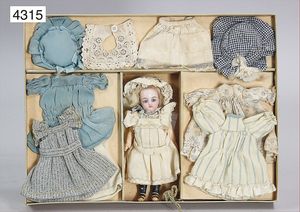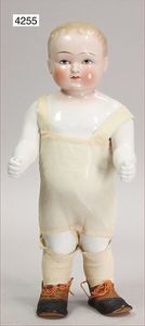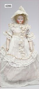 kl. Biskuitporzellankopf-Puppe, gemarkt S&C, 15 cm, Kurbelkopf, blaue fest eingesetzte Glasaugen, off. Mund, Zähne, Masse-Stehkörper, anmodellierte Schuhe u. Strümpfe mit Kleidungsstücken, im Orig.-Kart.
