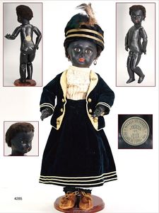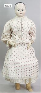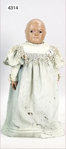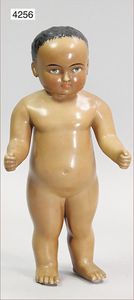 Motschmann, frühes außergew. Babys, dunkelhäutig, Papiermaché-Vollkopf, drehbarer Kopf, fest eingesetzte schwarze Glasaugen, kl. ausmodellierte Ohren, Nasenspitze etwas berieben, bewegl. Handgelenke, Hände schön ausmodelliert, bewegl. Füße, 53 cm, außergew. Gr., alte Kleidung