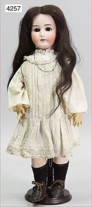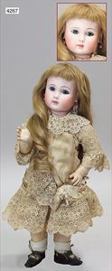 JUMEAU französisches Bébé, Tété Jumeau, sehr feines helles Biskuitporzellan, hellbraune feststehende Glasaugen, geschlossener Mund, durchstochene Ohren, französischer Gliederkörper, bewegliche Handgelenke, alter Korkdeckel, rot/ braune alte Perücke, Orig.-Kleid, teilw. Seide etwas verschlissen, alte Schuhe, mit Zugstimme, nicht funktionstüchtig, 49 cm, über dem Po leicht zu sehender blauer Stempel