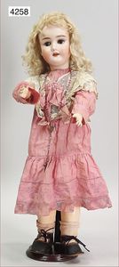 Biskuitporzellankopf-Puppe, gemarkt Speeial Germany, 58 cm, braune Schlafaugen, off. Mund, oben Zähne, Kinngrübchen, schöne volle alte Mohairperücke, Gliederkörper (nicht alle zueinander passend), altes Kleid