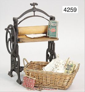 Puppenwäschemangel, Guss, 30 cm hoch, 18 cm breit, dazu Wäschekorb mit Zubehör, u.a. Mieder, Hosen, Unterhemden sowie Wäscheleine u. Wäscheklammern, schönes Konv.