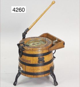 schönes Dekorationsstück für größere Puppe, Waschmaschine, Holz, Aufschrift „Schaede´s Schnellwaschmaschine, Franz U. Patent Schweiz“, 23 cm hoch, ausgefallen