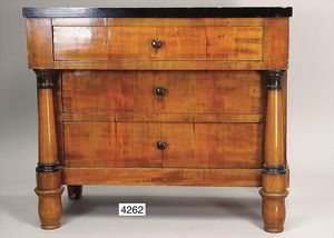 kleiner Biedermeier Modellschrank, 51,5 breit, 44,5 hoch, drei Schubladen, vorne Säulen, guter Zust., schöne Dekoration für eine große frühe Puppe