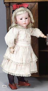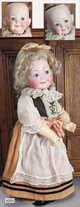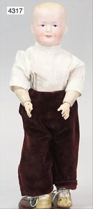 GEBR. HEUBACH Pouty, Charakter Junge, rosa gefärbtes Porzellan, typisch für diese Puppe, geschl. Mund, Toddlerkörper mit hochgezogenen Kniegelenken, Perücke neuer, 62 cm, außergew. Größe, alte Kleidung, Schuhe und Strümpfe