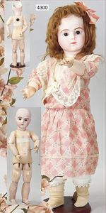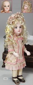 Tete Jumeau, Biskuitporzellan-Kurbelkopf, gemarkt mit rotem Stempel Tete Jumeau nr. 7, blaue fest eingesetzte Glasaugen off. Mund, oben Zahnreihe, durchst. Ohren, franz. Gliederkörper, 47 cm, lockige Perücke, neuer, altes Kleid, alte Unterkleidung