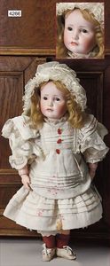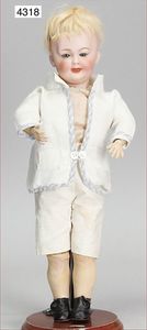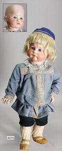 ARMAND MARSEILLE Biskuitporzellan-Vollkopf, Charakterjunge, gemarkt 500 D.R.G.M. Germany A.1.M., blaue Intaglioaugen, geschl. Mund, fein ausmodellierte blonde Haare, Gliederkörper, Hände wohl neuer, ca. 34 cm, alte Schuhe