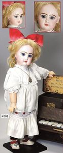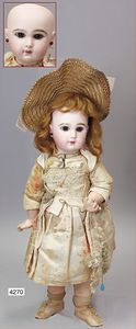 SIMON & HALBIG Dep., franz. Automat, Kindergesicht, Glasaugen, Wimpern aus Fäden, off. Mund, oben Zähne, leichte Kinngrübchen, Biskuit-Unterarme, Seidenkleid stark verschlissen, fest aufgeklebte Mohairperücke, Perücke wurde nicht entfernt, von außen keine Risse erkennbar