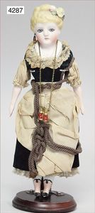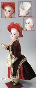 STEINER Kiki Steiner, Automat, Frankreich, Biskuitporzellan-Vollkopf, fest stehende blaue Paperweightaugen, off. Mund, oben und unten Zahnreihe, Masse-Körper mit Lederrumpf, mit Schlüssel, Uhrwerk hängt, ca. 43 cm, alte Haube mit Mohairperücke