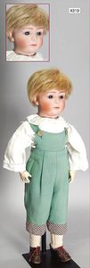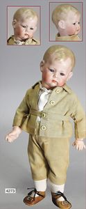 GEBR. HEUBACH Biskuitporzellan-Kurbelkopf, Charakterjunge, Nackenmarkierung 7079 Germany Nr. 1, Sonnenzeichen, blaue Schlafaugen, off./geschl. Mund, leicht lächelnd, ca. 33 cm, Kleidung neuer, blonde Mohairperücke