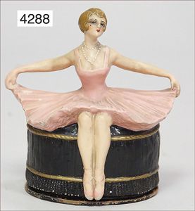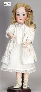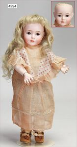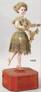 Automat, Balletttänzerin, Biskuitporzellan-Kurbelkopf, auf Biskuitporzellan-Brustblatt, gemarkt S & H Germany Nr. 2, blaue fest eingesetzte Glasaugen, Echthaar, off. Mund, oben Zähne, Biskuit-Arme, alte Kleidung, blonde fest aufgeklebte Mohairperücke, Riss seitl., 1 Brandriss hinter dem Ohr, mit Musikspielwerk, Funktionstüchtig, Höhe der Puppe ca. 41 cm, Gesamthöhe 50 cm, feines Spitzenkleid, Stoff Blumenschmuck, sehr dekorativ