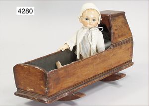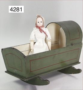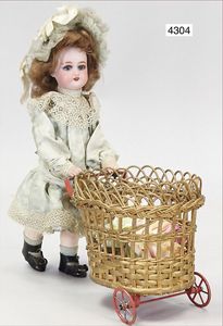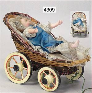 frühes Motschmann-Baby, in Stroh geflochtenem Kinderwagen, handbemalte Holzräder, Papiermaché-Kopf, Wachs überzogen, fest eingesetzte schwarze Glasaugen, Masse-Arme und -Beine, ca. 1880, schöner Orig.-Zust., museal, 26 cm lang, 17 cm hoch, ausgef.