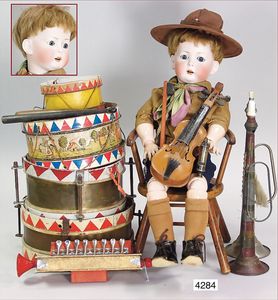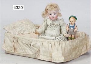 Automat, Biskuitporzellan-Kurbelkopf, gemarkt S & H 1079-2 dep. Germany, Funktionstüchtig, Uhrwerk hängt ein wenig, Biskuitporzellan-Kindergesicht, Wimpern aus einzelnen Fäden, fest eingesetzte blaue Glasaugen, off. Mund, oben Zahnreihe, Biskuit-Hände, Schlüssel fehlt, altes Seidenkleid, teilw. stark verschlissen, alte Schuhe mit geflochtenem Korb, 29 cm Höhe, Länge 24 cm, alte Mohairperücke mit Haube, dekorativ