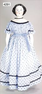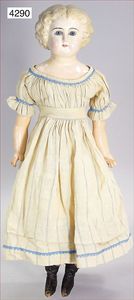 Königin Eugenie, Parian-Brustblattkopfpuppe, 55 cm, blaue gemalte Augen, geschl. Mund, fein ausmodellierte Haare, mit Blumenschmuck, Blätter teilw. ausgebessert o. Fehlstellen, anmodellierte Perlenkette, alte Kleidung, Unterkleidung, Schuhe u. Strümpfe