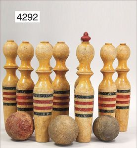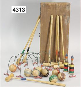 Kinder-Cricketspiel, um 1910, Schläger 32 cm, schöne Puppendekoration