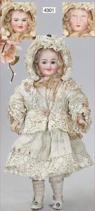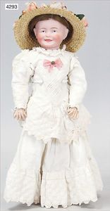 Biskuitporzellankopf-Puppe, gemarkt B3, 54 cm, Kurbelkopf, braune Schlafaugen, off. Mund, oben Zähne, Kinngrübchen, Echthaarperücke, alte Kleidung