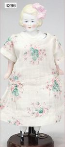 Biskuitporzellan-Brustblatt, Parian, gemarkt Germany, Mädchen mit ausmodellierten blonden Haaren, Pagenschnitt, ausmodellierter Haarschmuck, rosa Schleife, blaue gemalte Augen, geschl. Mund, Brustblatt mit Blusenansatz, blaue Spitze, Stoffkörper, Biskuit-Unterarme und -Beine, ausmodellierte Schuhe und Strümpfe, 26 cm Stehhöhe