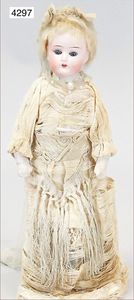 Biskuitporzellan-Brustblattkopf-Puppe, Braut, Vollkopf, Parian, blaue fest stehende Glasaugen, off. Mund, Nackenmarkierung nicht erkennbar, Stoffkörper, Masse-Unterarme, Seidenkleid, alt, stark verschlissen, 32 cm, mit Schleier u. Haarschmuck