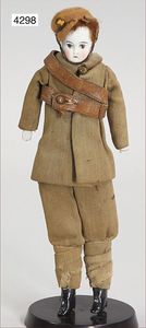 Biskuitporzellan-Brustblattkopf, kl. Soldat, sehr helles Porzellan, braune gemalte Augen, Stoffkörper, Biskuit-Unterarme u. –Beine, ausmodellierte Stiefel, 21 cm, auch geeignet für Puppenstubenpuppe