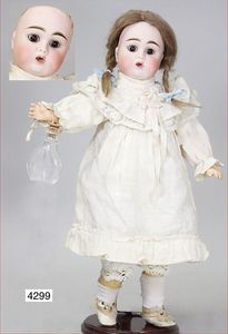 JUMEAU französisches Bébé, Tété Jumeau, sehr feines helles Biskuitporzellan, Nackenmarkierung 8, feststehende blaue Strahlenaugen, geschl. Mund, durchstochene Ohren, französischer Gliederkörper, bewegliche Handgelenke, über dem Po blauer Stempel, Bébé Jumeau, alter Korkdeckel, alte Kleidung und Schuhe, blonde alte Perücke