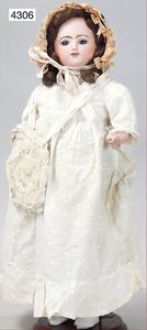 JUMEAU Französisches Bébé, Biskuitporzellan-Kurbelkopf, Nackenmarkierung eingerizt M12, blaue fest eingesetzte Stralenaugen, geschl., Mund, Kinngrüpchen, durchstochene Ohren, franz. Gliederkörper, über dem Po blauer Stempel, Bébé Jumeau, Diplóme d Honneur, altes Kleid, Schuhe und Strümpfe, alte Echthaarperücke, sehr schöner Ausdruck