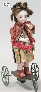 Automat, Frankreich, wohl Gaultier, Biskuitporzellan-Kurbelkopf, fest stehende braune Glasaugen, geschl. Mund, durchst. Ohren, fest aufgeklebte Perücke, von außen keine Risse erkennbar, auf Blech-Dreirad, Kopf und Arme bewegen sich, Biskuit-Unterarme, Masse-Körper, alte Kleidung, Seide stark verschlissen, ca. 29 cm hoch, sehr dekorativ