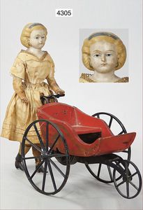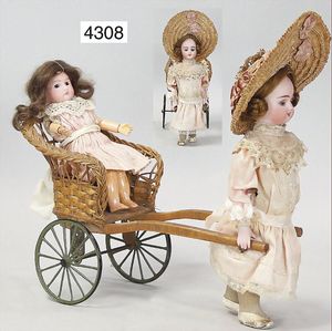 Halbautomat, Frankreich, Frau mit Rikscha, Biskuitkopf, blaue fest stehende Glasaugen, Wimpern aus einzelnen Fäden, off. Mund, oben 2 Zähne, durchst. Ohren, Biskuit-Unterarme, Rikscha mit Gussspeichenräder, darauf Biskuitporzellan-Kurbelkopf-Puppe, fest eingesetzte braune Glasaugen, geschl. Mund, Gliederkörper, Höhe ca. 30 cm, Länge ca. 22 cm