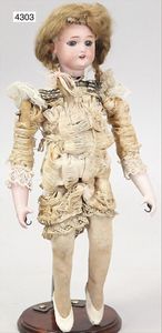 JUMEAU Nr.15, Biskuitporzelankopf-Puppe, Frankreich, 80 cm, Kurbelkopf, blaue fest eingesetzte Glasaugen, off. Mund, oben Zähne, Kinngrübchen, durchst. Ohren, franz. Gliederkörper, Kleidung alt oder aus alten Stoffen genäht, Perücke neuer