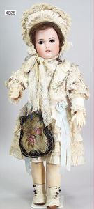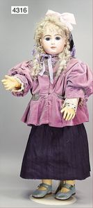 SIMON & HALBIG für JUMEAU Nr.1907, Biskuitporzelankopf-Puppe, 68 cm, Kurbelkopf, blaue fest eingesetzte Paperweightaugen, off. Mund, oben Zähne, Kinngrübchen, durchst. Ohren, Gliederkörper, Farbabplatzer an den Händen, 1 Finger ergänzt, Perücke neuer, Kleidung aus alten Stoffen genäht