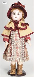 GAULTIER Modepuppe, Biskuitporzellan-Brustblatt, nachtr. fest eingesetzte blaue Glasaugen, geschl. Mund, durchst. Ohren, einfacher Lederkörper, wohl alte Kleidung o. aus alten Stoffen genäht, 27 cm, alte Mohairperücke