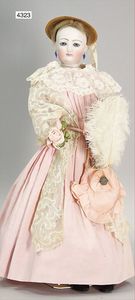 JUMEAU Modepuppe, Frankreich, gem. 6, 56 cm, Biskuitkurbelkopf, fest eingesetzte blaue Paperweightaugen, geschl. Mund, durchst. Ohren, Orig.-Mohairperücke, Biskuit-Brustblatt, Lederkörper, alte Kleidung und Unterkleidung